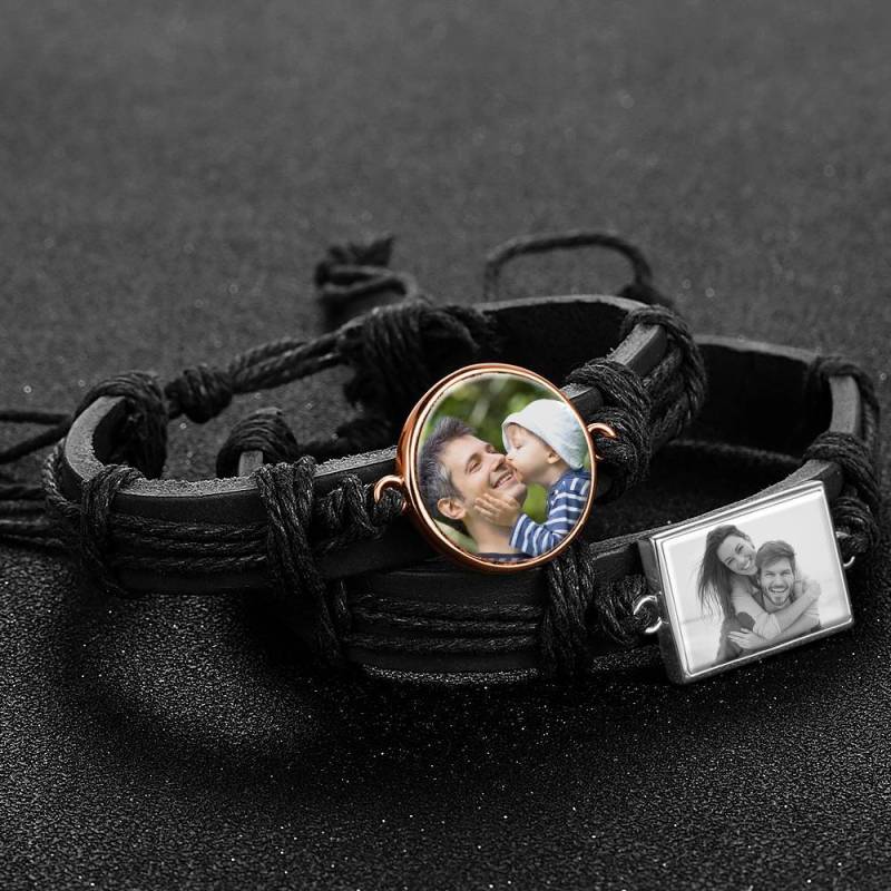 Colorful Black Leather Round-shaped Photo Bracelet Rose Gold Plated