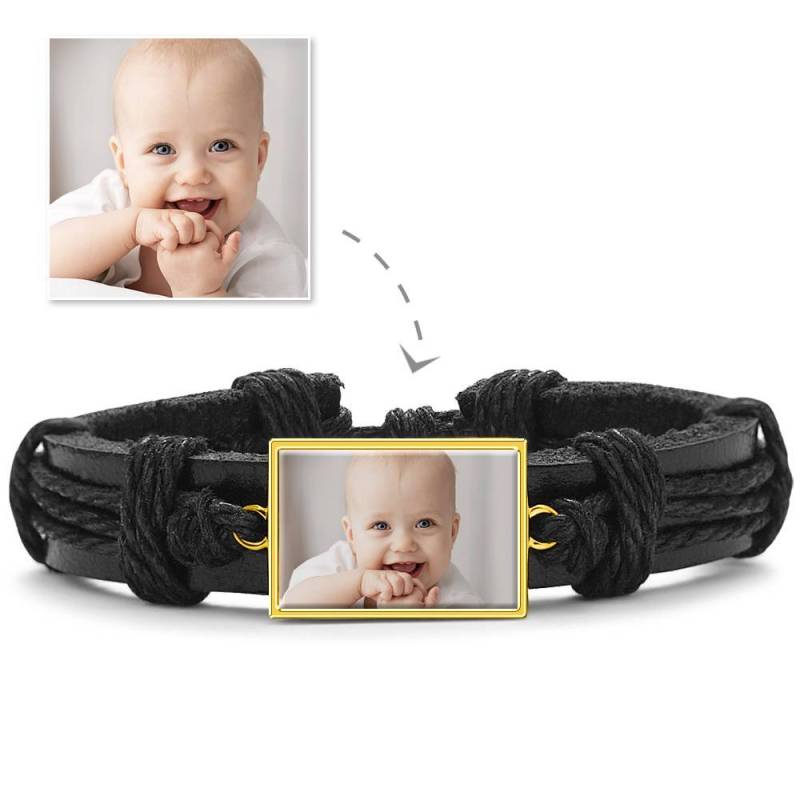 Colorful Black Leather Square-shaped Photo Bracelet 14K Gold Plated