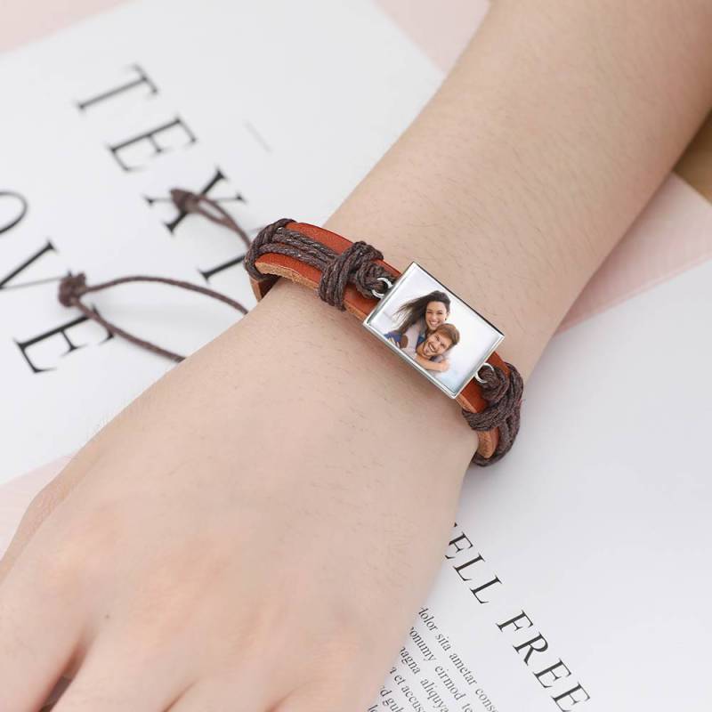 Colorful Brown Leather Square-shaped Photo Bracelet Silver Plated