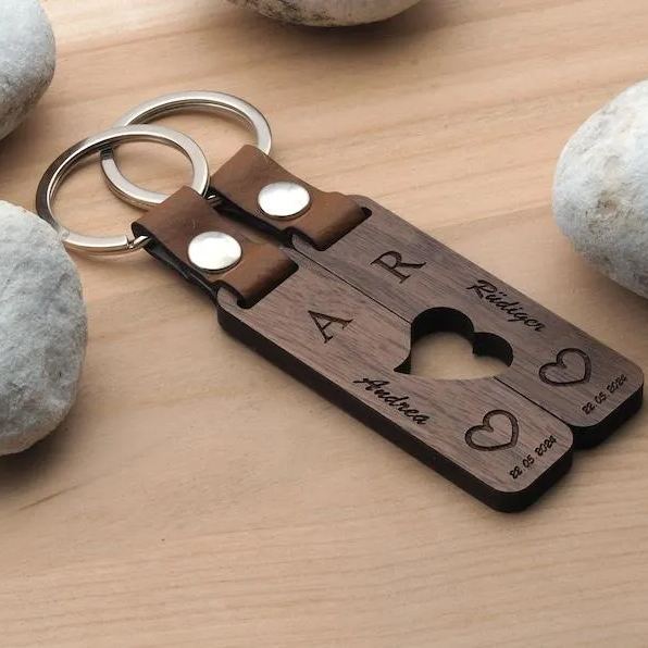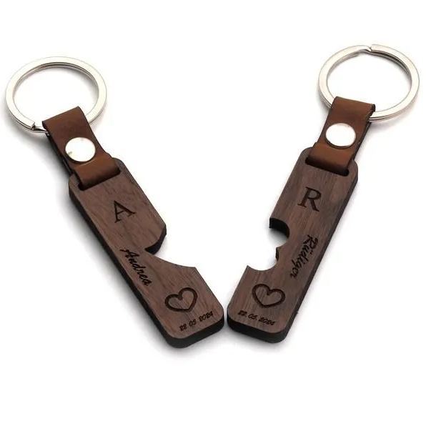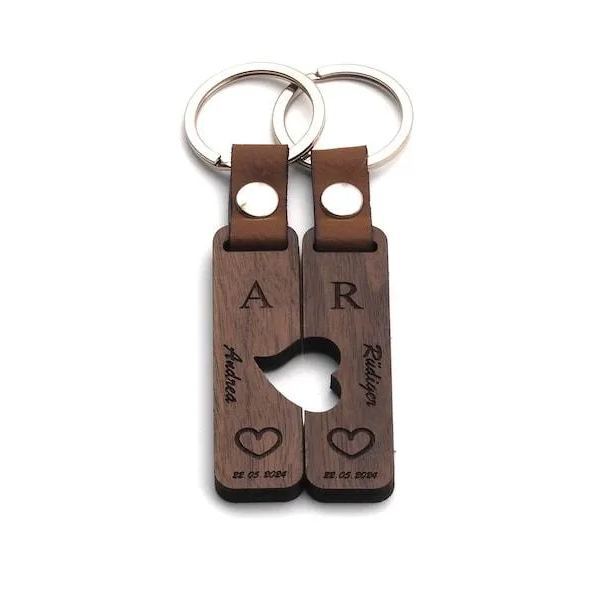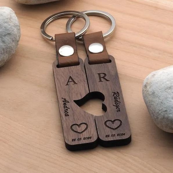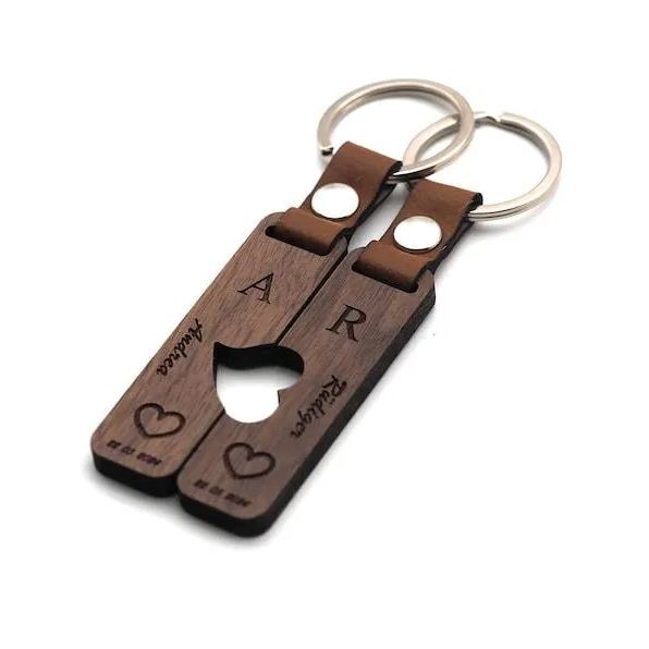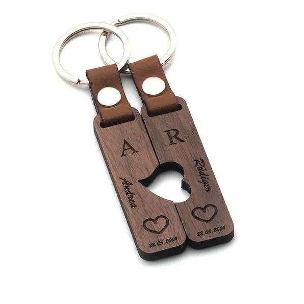 Couple Puzzle Keychain Set – Personalised Wooden Keyring with Engraved Names & Symbols Matching Gift for Partners or Best Friends