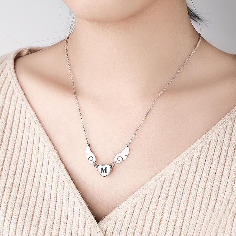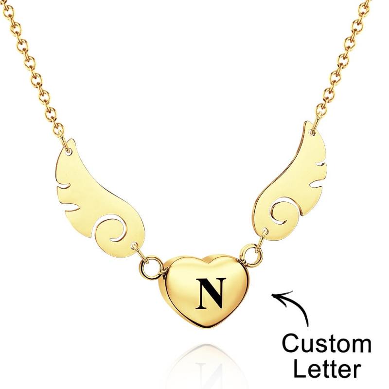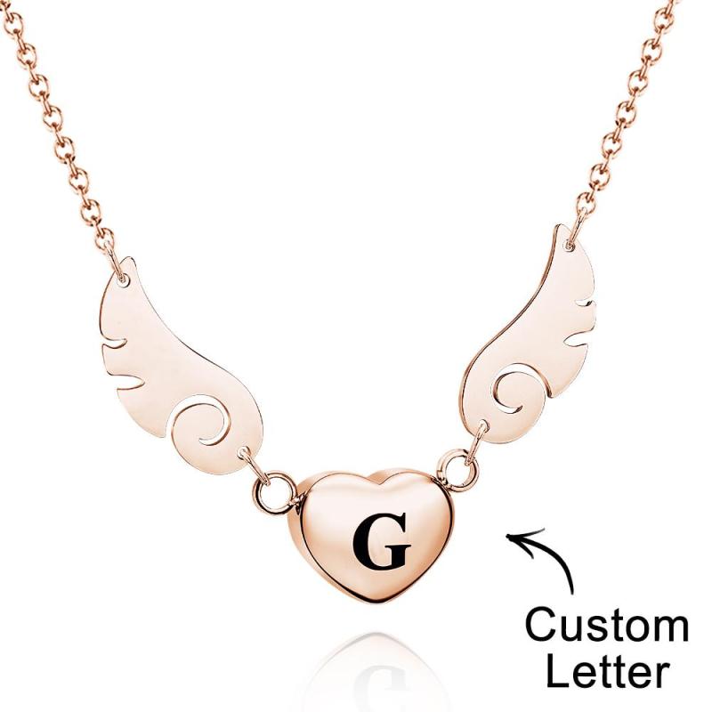 Custom Engraved Angel Wings Necklace With Letter Heart Charm Jewelry Gifts For Her