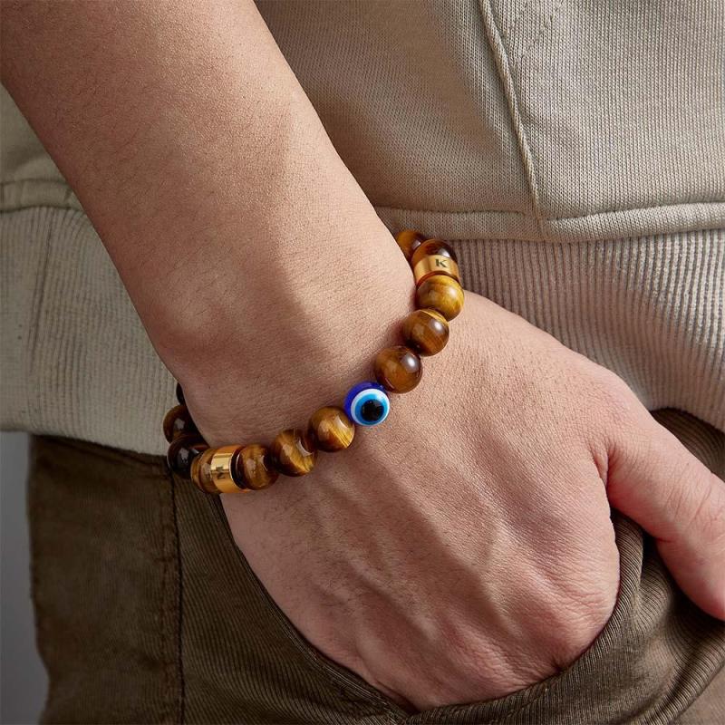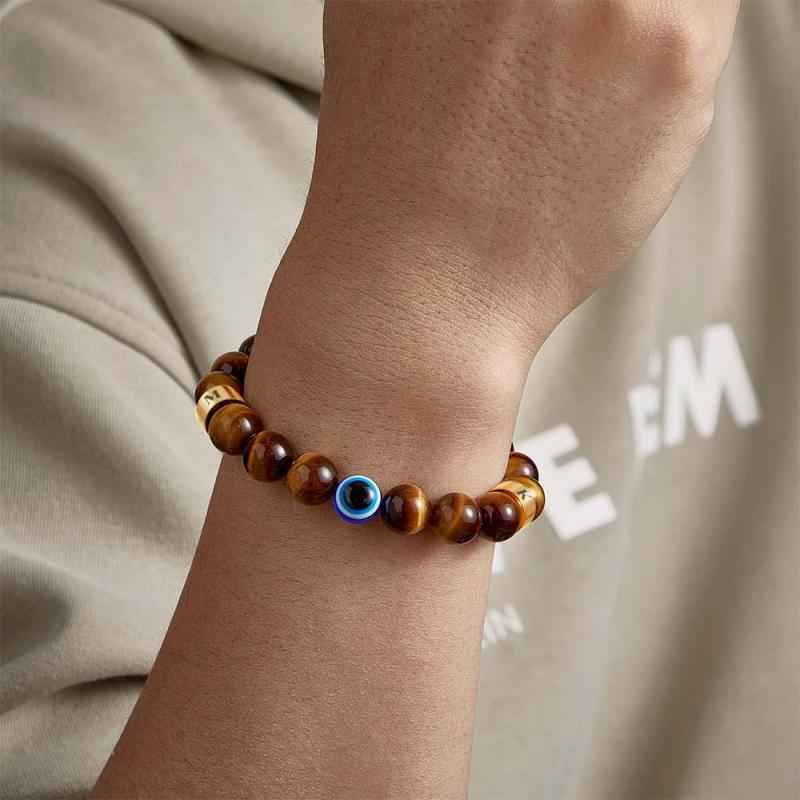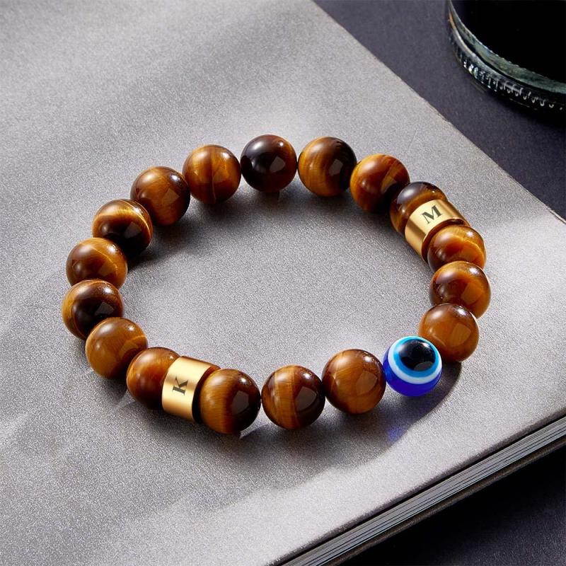 Custom Engraved Bracelet Amulet Evil Eye Gold Tiger Eye Beaded Bracelet for Men