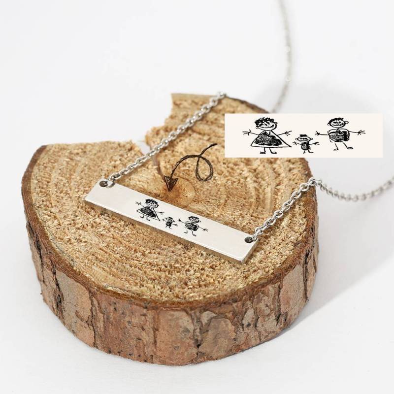 Custom Kids Drawing Photo Neckalce, Children Artwork Bar Neckalce Copper in Silver