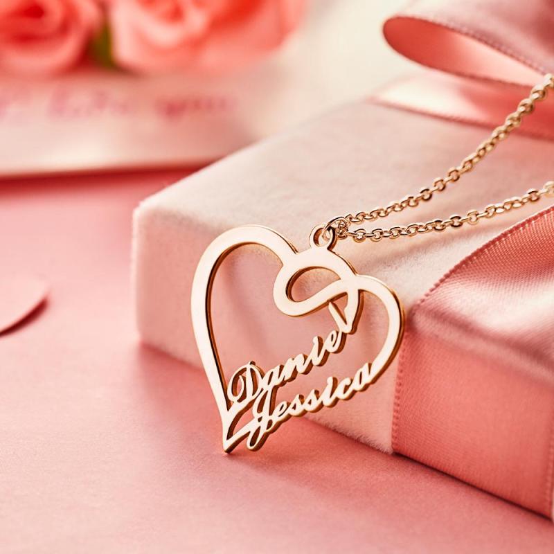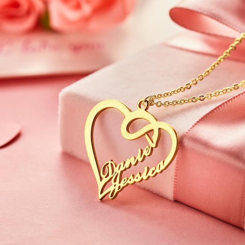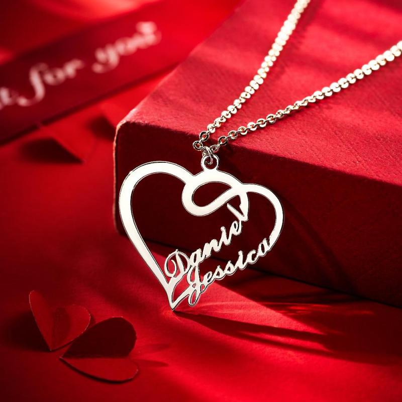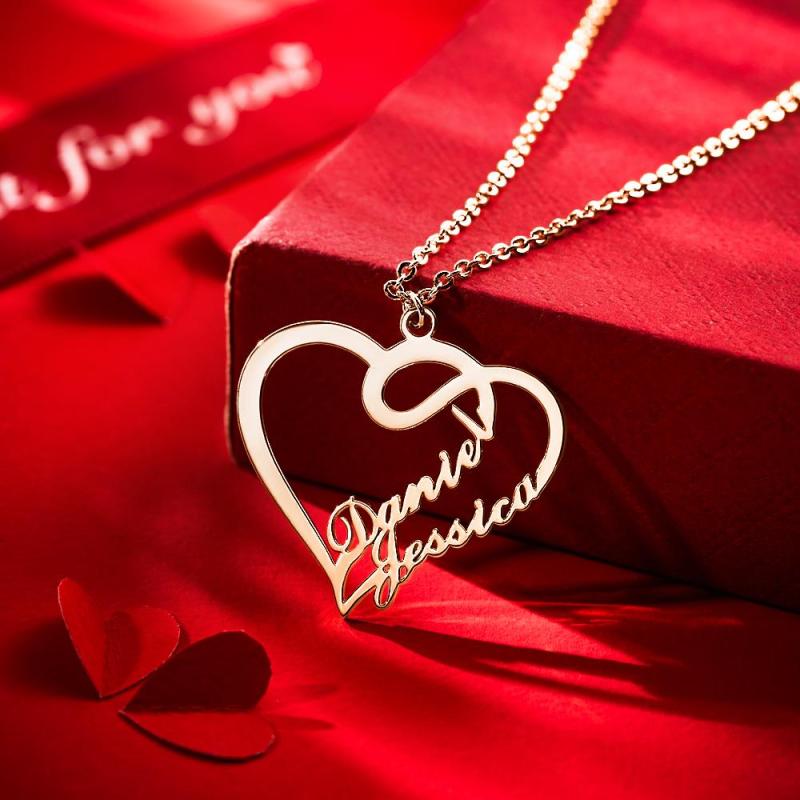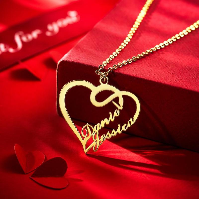 Custom Overlapping Heart Two Name Necklace Valentine's Gifts Nameplates Necklace14k Gold Plated For Her