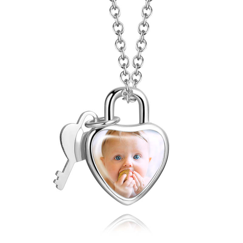 Custom Photo Heart Lock and Key Necklace with Engraving
