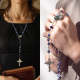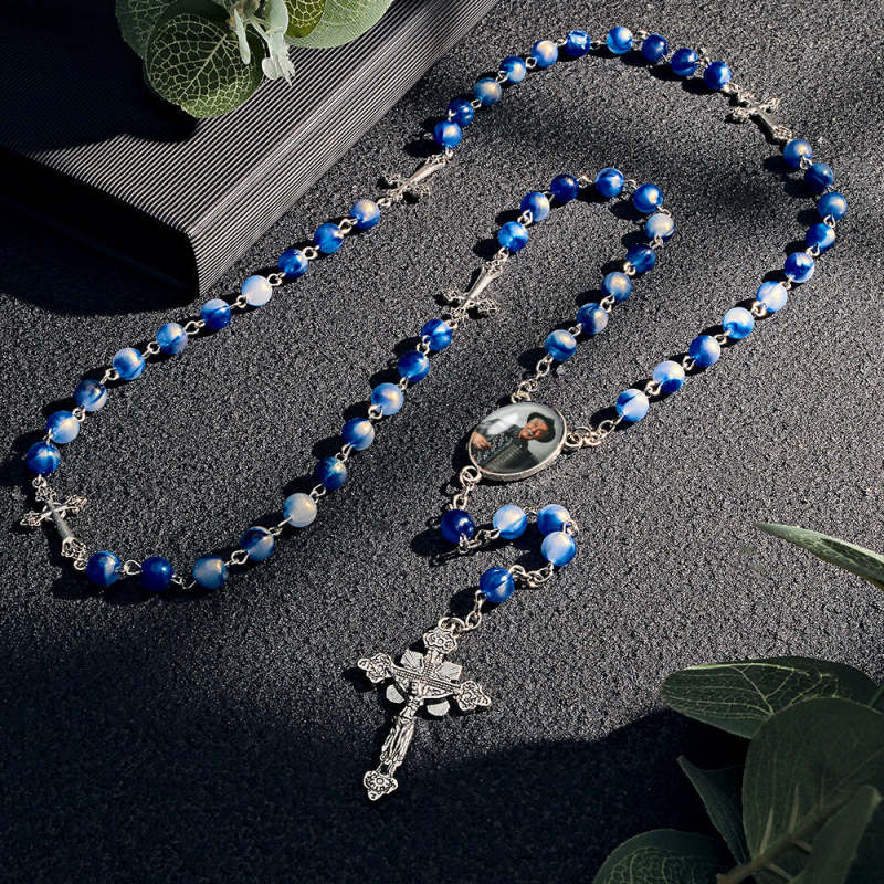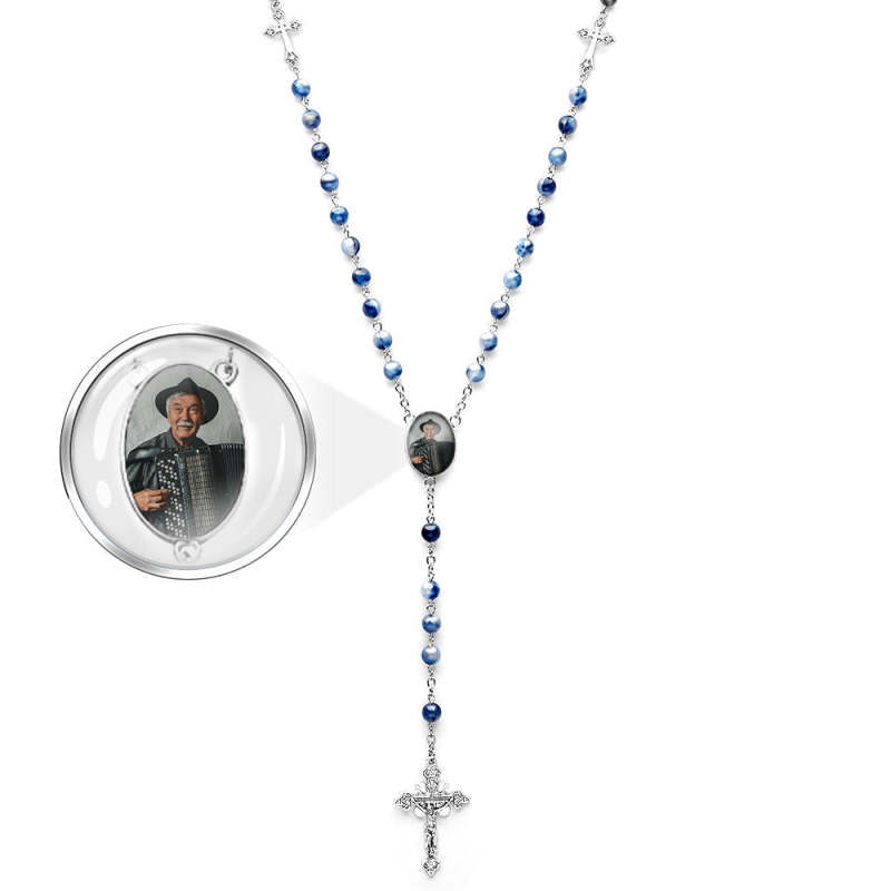 Sentimental Memorial Gifts for Catholics Custom Rosary Beads Cross Necklace Personalized Blue Acrylic Beads Necklace with Photo