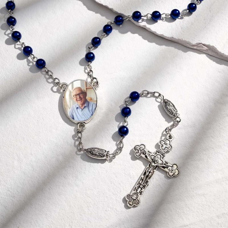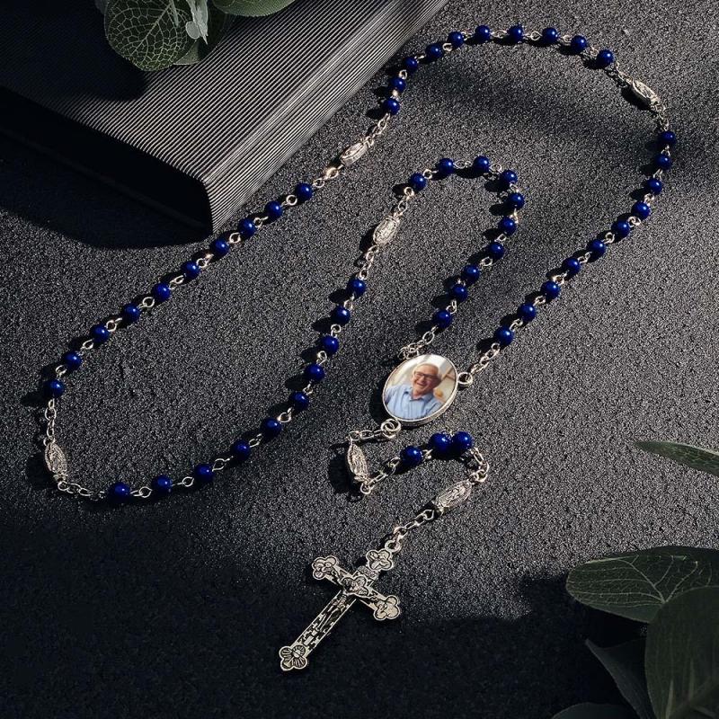 Custom Rosary Beads Cross Necklace Sentimental Memorial Gifts for Catholics Personalized Blue Imitation Pearls Necklace with Photo