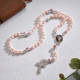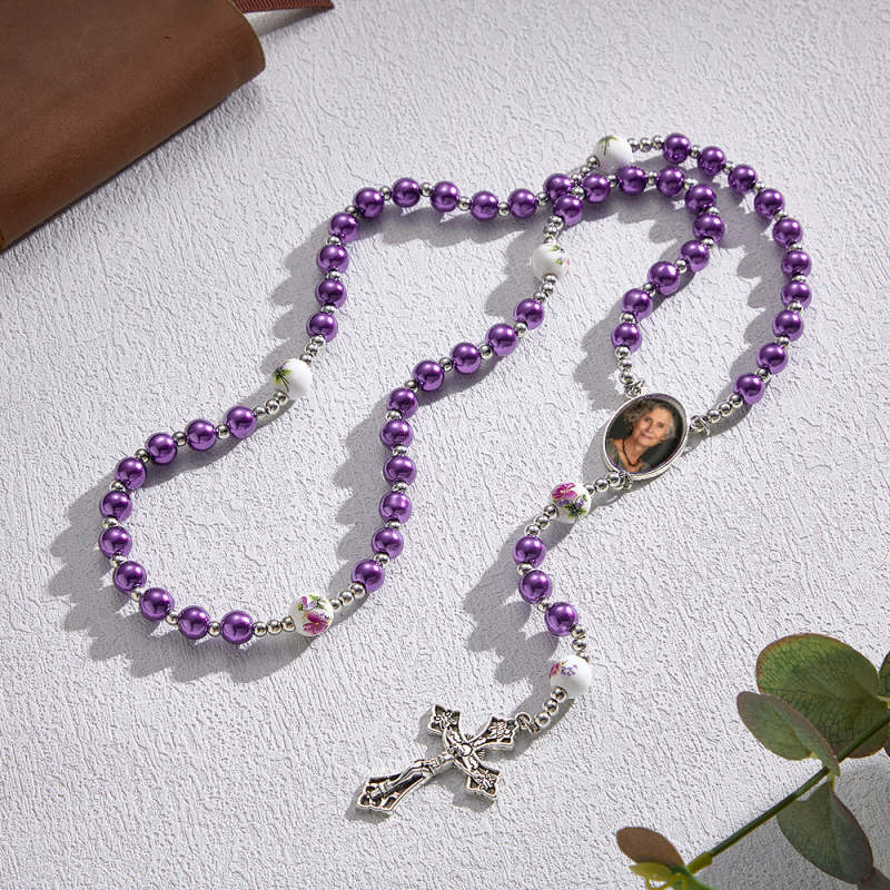 Sentimental Memorial Gifts for Catholics Custom Rosary Beads Cross Necklace Personalized Ceramic Rose Glass Imitation Pearl Necklace with Photo
