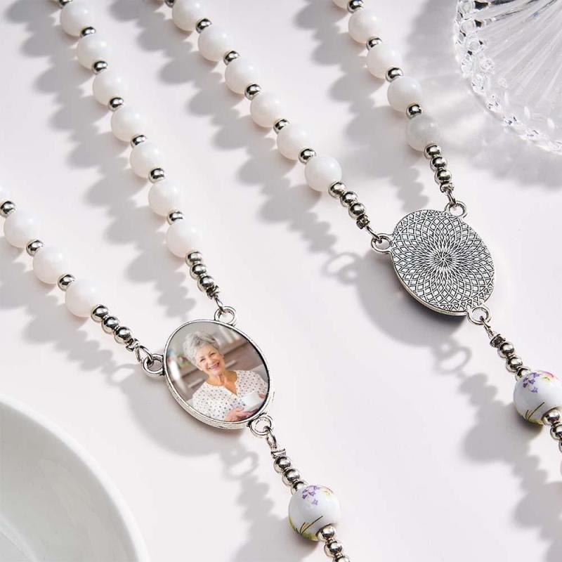 Sentimental Memorial Gifts for Catholics Custom Rosary Beads Cross Necklace Personalized Ceramic Rose Necklace with Photo