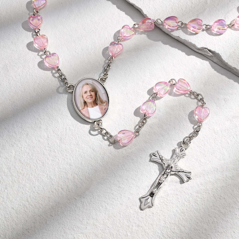 Sympathy Gifts Custom Rosary Photo Necklace Personalized Cross Heart Necklace with Photo