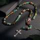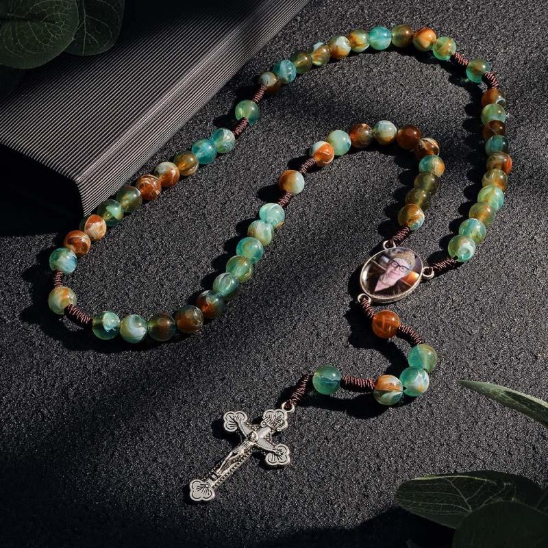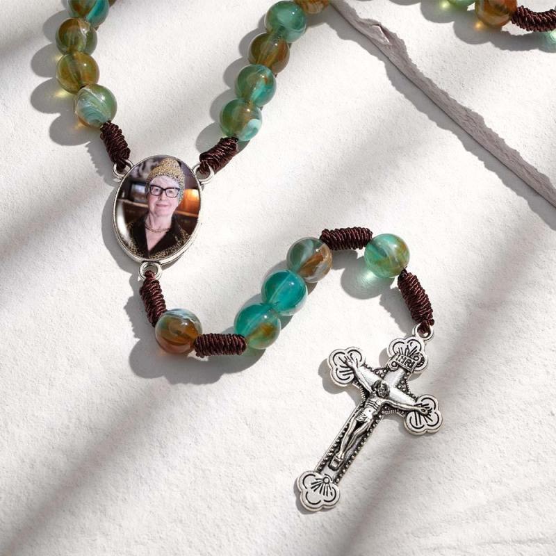 Custom Rosary Beads Cross Necklace Sentimental Memorial Gifts for Catholics Personalized Imitation Agate Round Beads Necklace with Photo