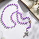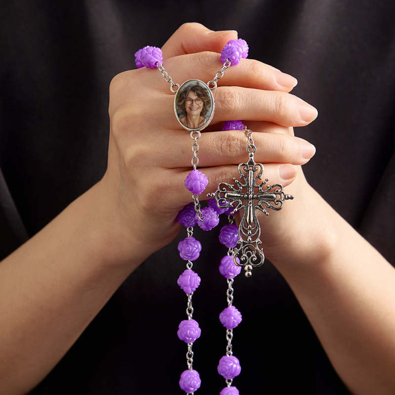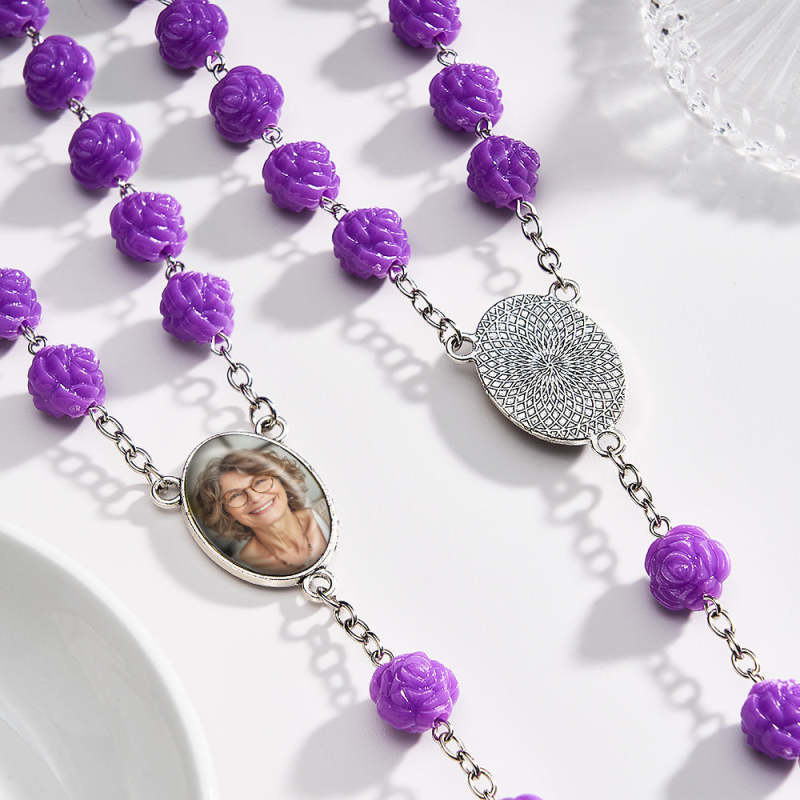 Custom Rosary Beads Cross Necklace Personalized Purple Double Sided Rose Necklace with Photo