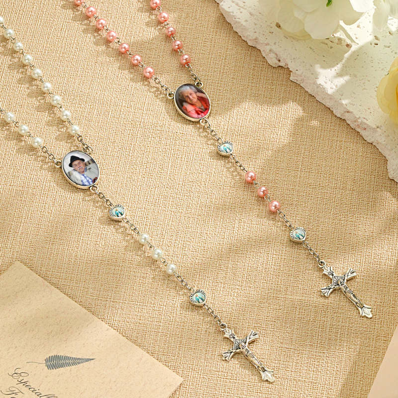 Custom Rosary Beads Necklace Sentimental Memorial Gifts for Her Personalized Glass Imitation Pearls Cross Necklace with Photo