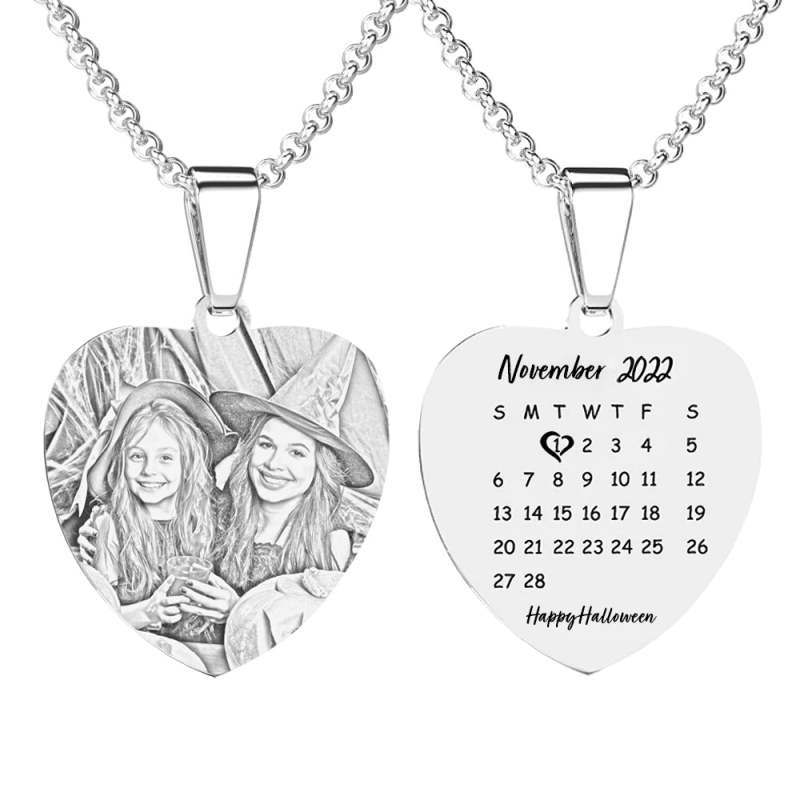 Engraved Heart Calendar Tag Photo Necklace Stainless Steel Halloween Gift