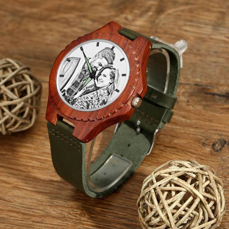 Unisex Engraved Photo Watch 48mm Wood Grain and Dark Green Strap - Sketch
