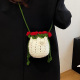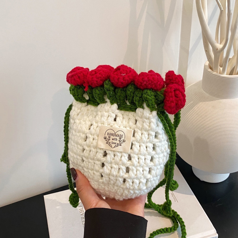 Hand-Knitted Rose Design Mini Bucket Bag Crocheted Flower Drawstring Bag Cute Crocheted Rose Bucket Bag