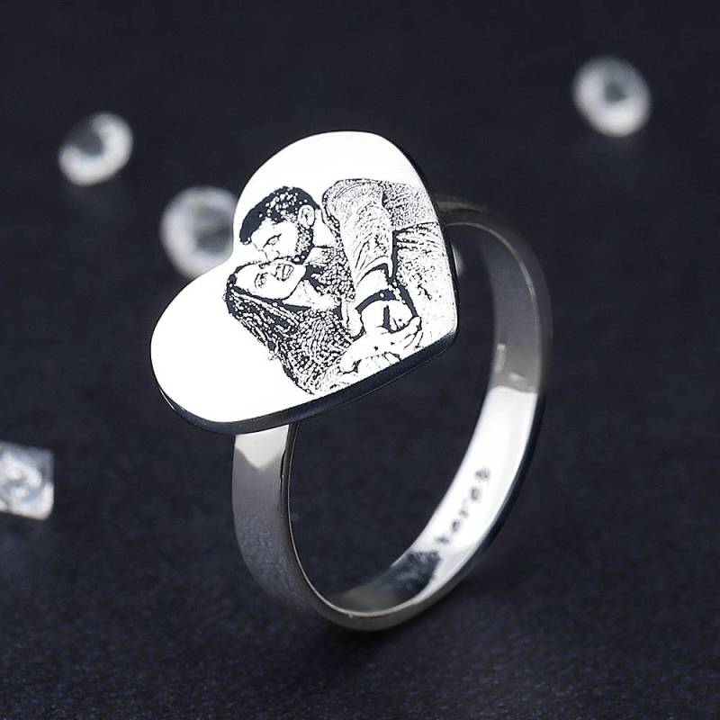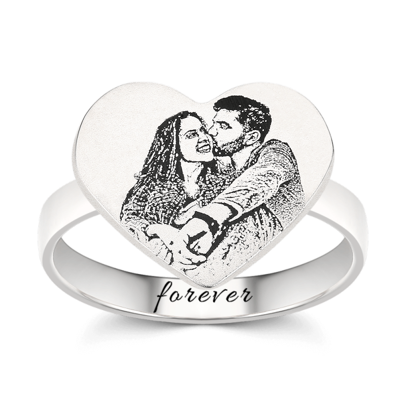 Heart Photo Engraved Ring With Engraving Platinum Plated Silver