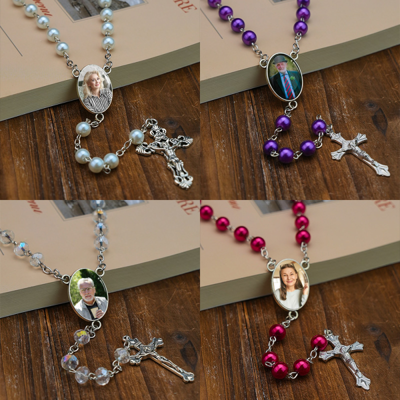 Memorial Gift Custom Rosary Beads Cross Multi-Color Necklace Sentimental Memorial Gift Baptism Gift, First Communion Gift, Confirmation, Baby or Little Girl Keepsake Prayer Personalized Necklace with Photo