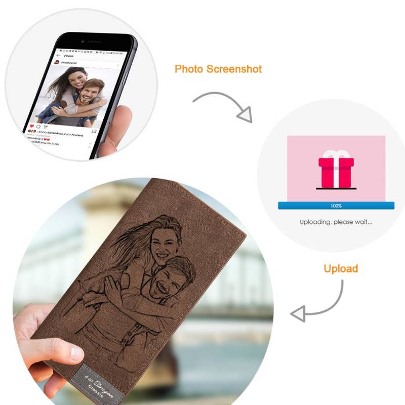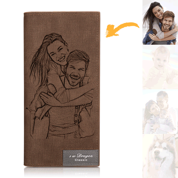 Men's Photo Engraved Long Style Bifold Photo Wallet - Brown Leather For Him