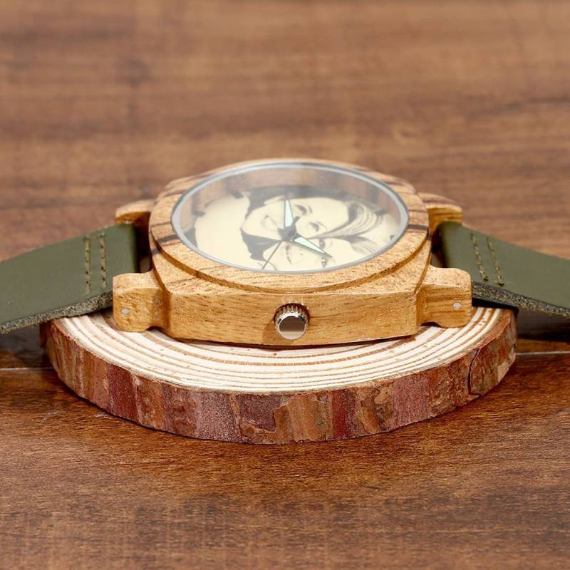 Men's Engraved Bamboo Photo Watch Dark Green Leather Strap 45mm
