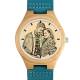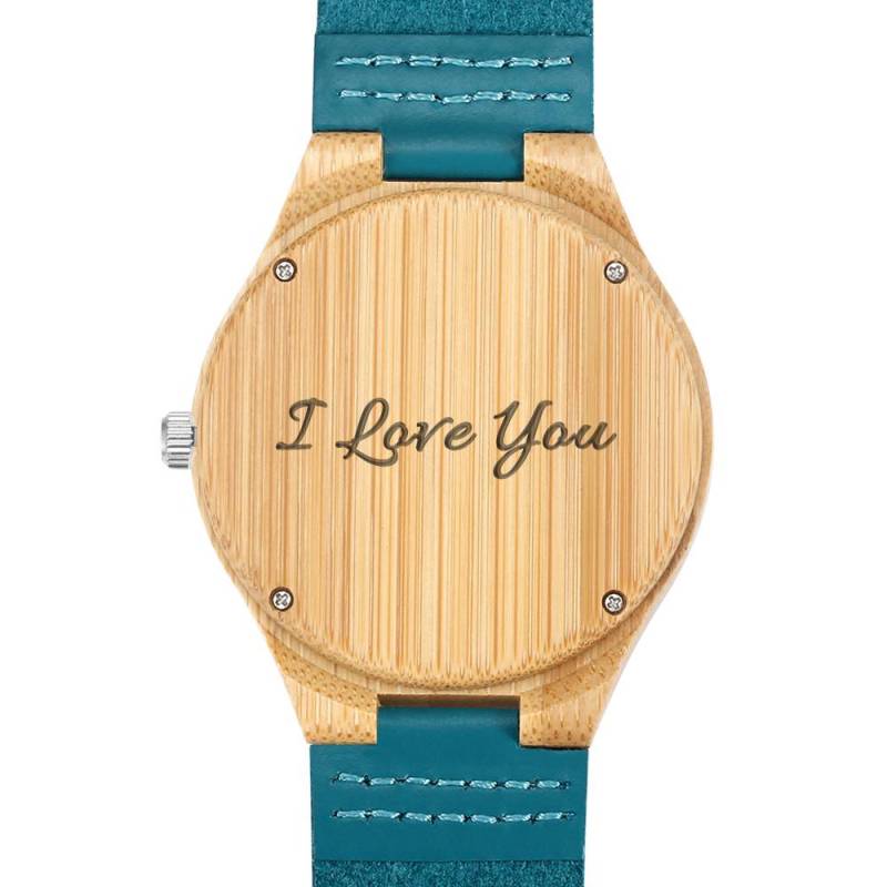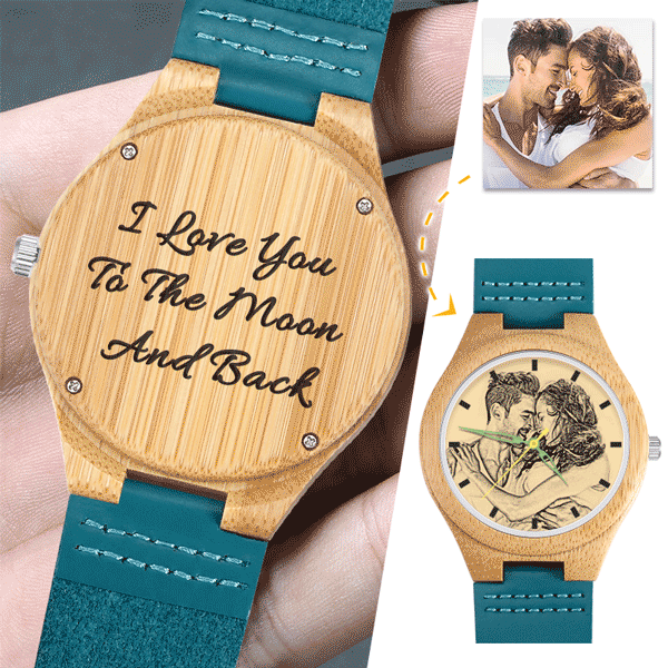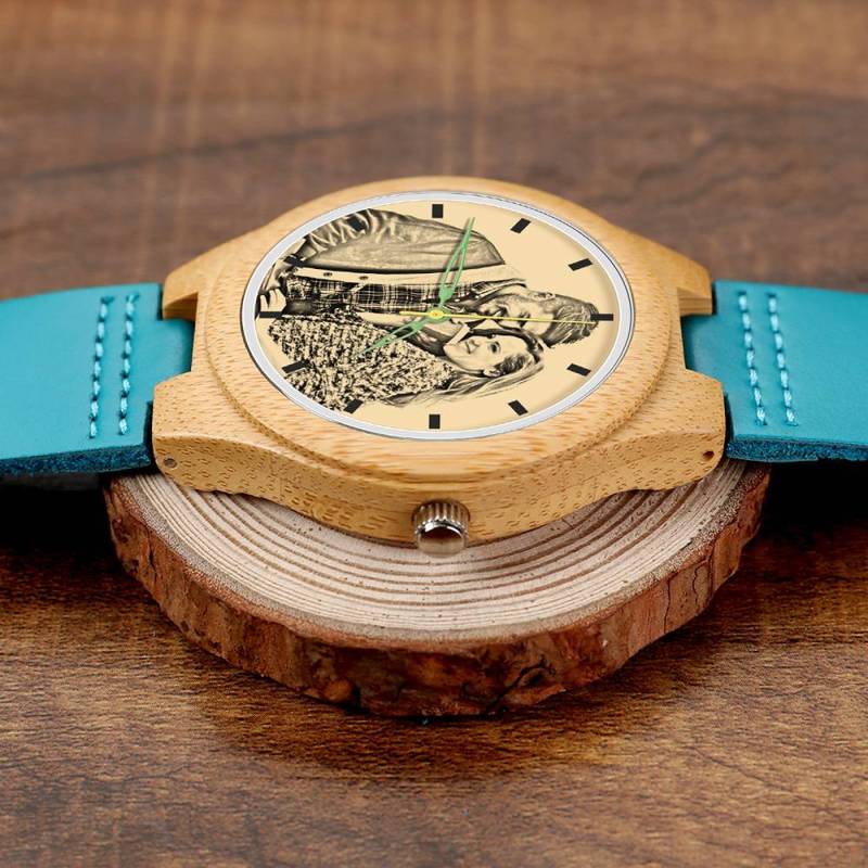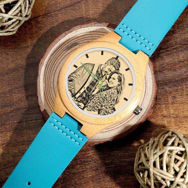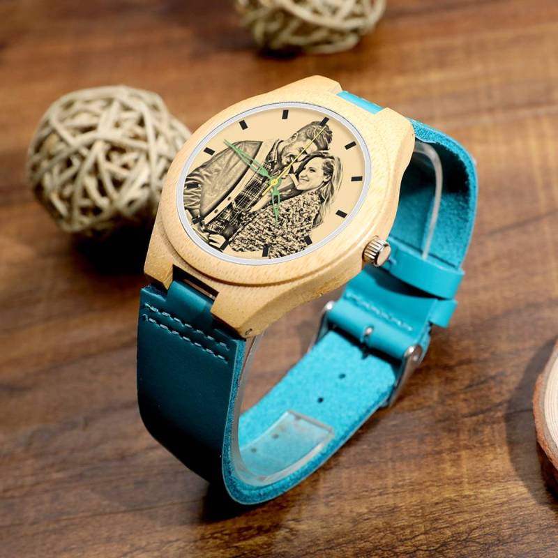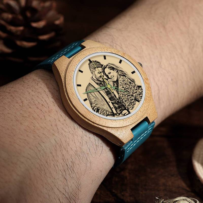 Men's Engraved Wooden Photo Watch Blue Leather Strap