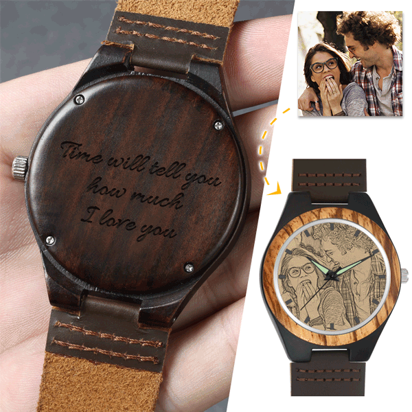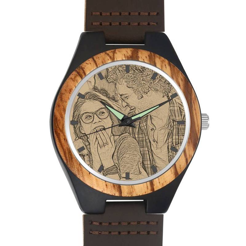 Men's Engraved Wooden Photo Watch Brown Leather Strap 45mm