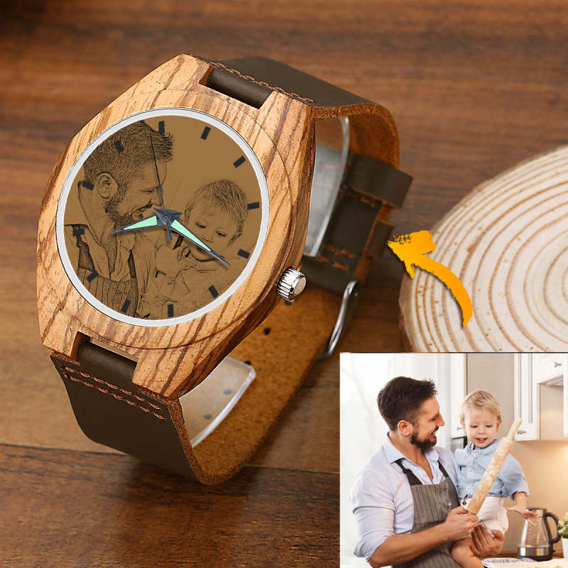 Father's Day Gift Men's Engraved Wooden Photo Watch Brown Leather Strap 45mm