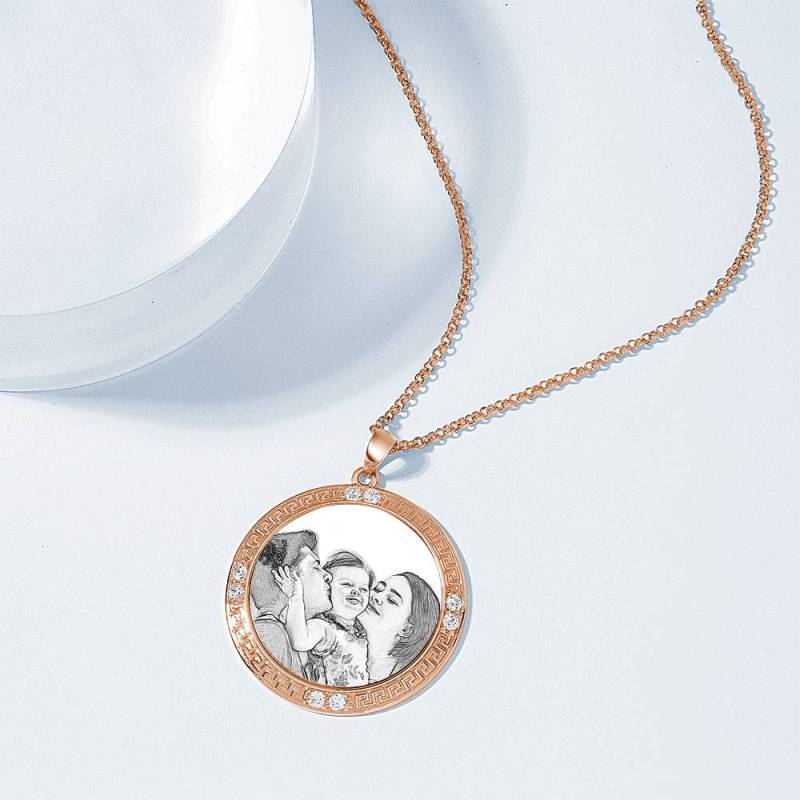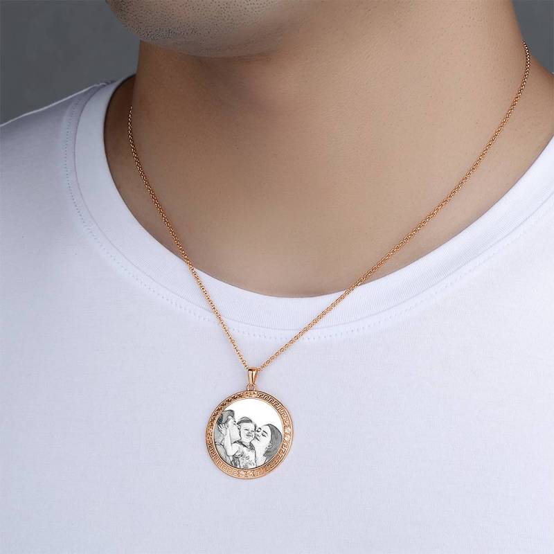 Men's Personalized Rhinestone Crystal Round Shape Photo Engraved Necklace Rose Gold Plated - Sketch