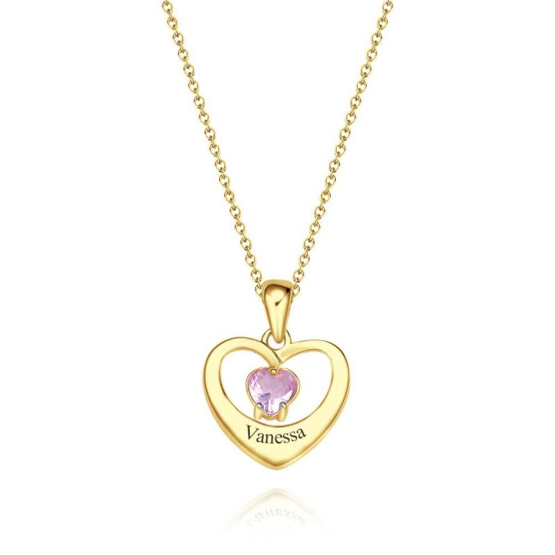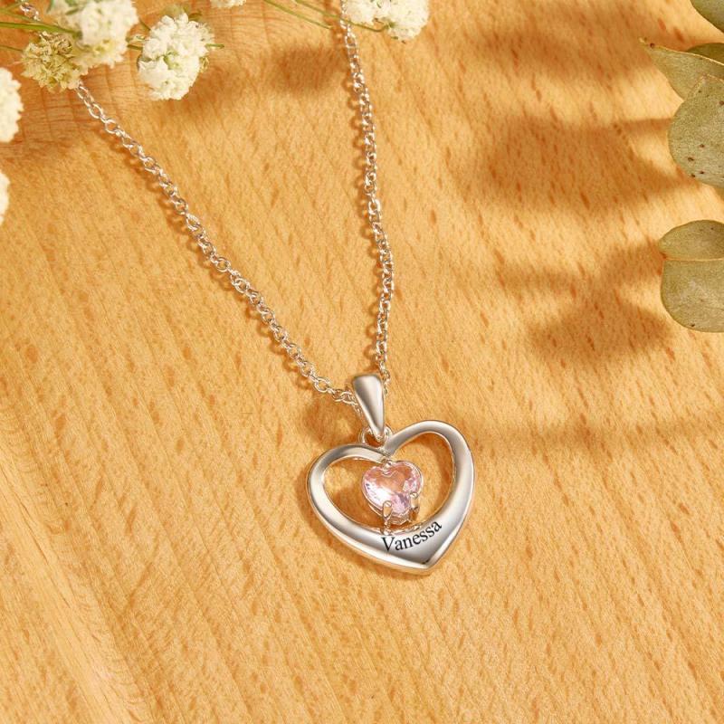 Personalized Birthstone Necklace With Text Hollow Cut Heart Pendant Gifts For Her