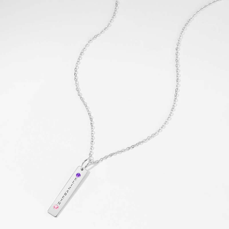 Personalized Birthstone Vertical Bar Necklace With Engraving Silver