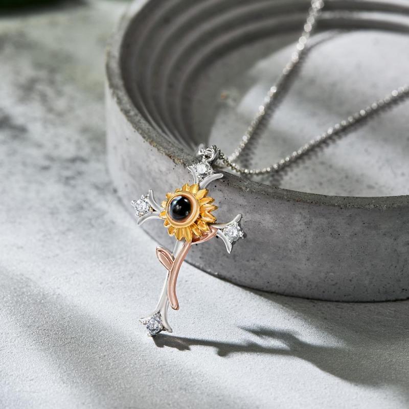 Personalized Cross Flower Photo Projection Necklace Custom Photo Sunflower Necklace for Women