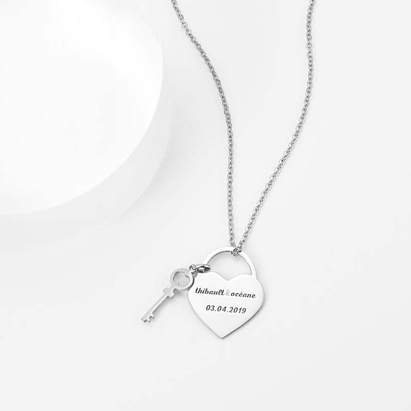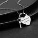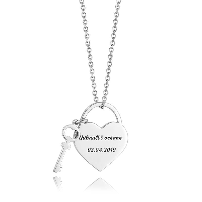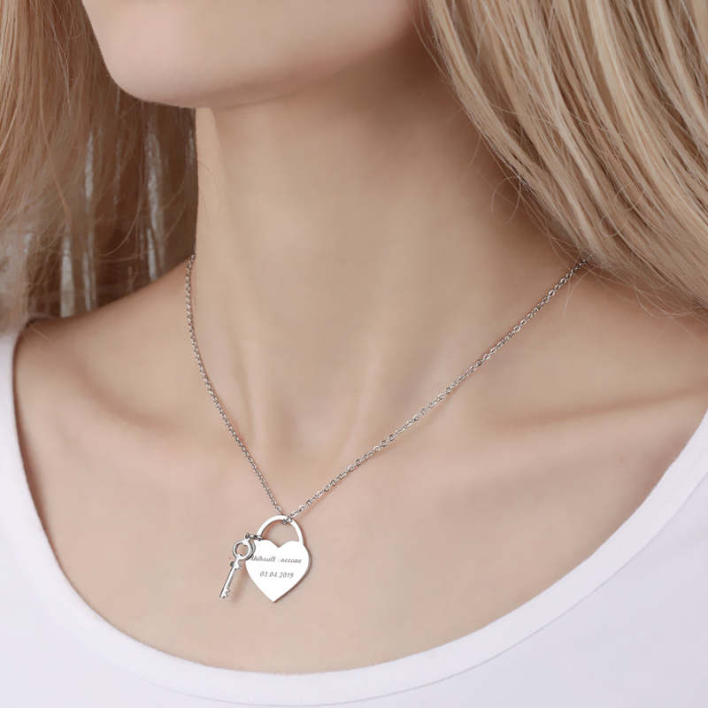 Personalized Engraved Necklace Heart Lock and Key in Silver