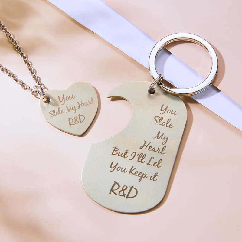 Personalized Photo Couple Keychain Necklace Set Steal My Heart Custom Engraved Keychain for Couples