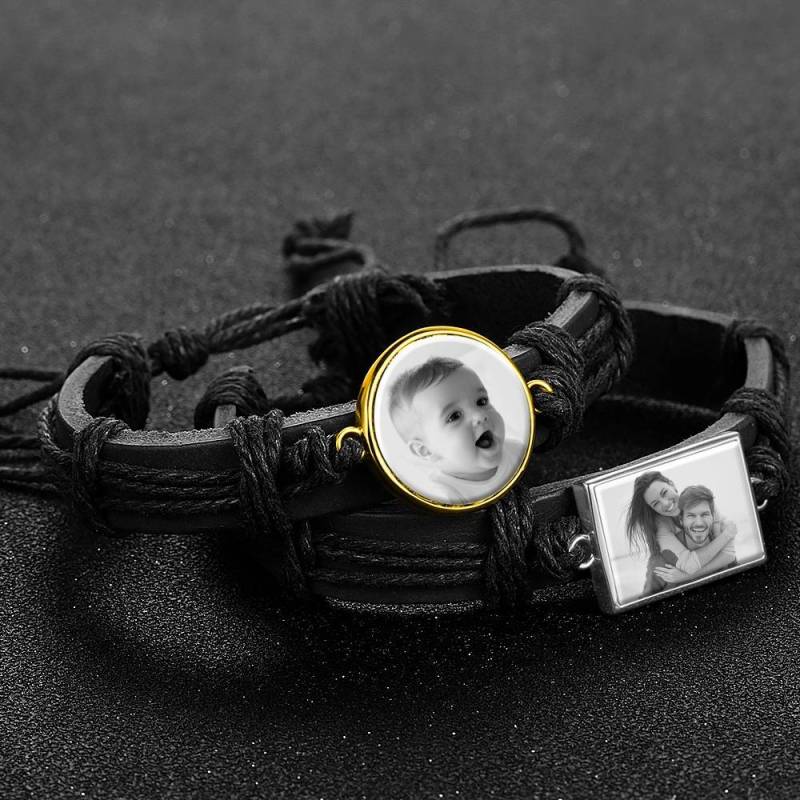 Photocopying Black Leather Round-shaped Photo Bracelet 14K Gold Plated