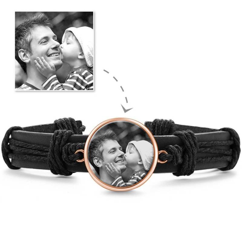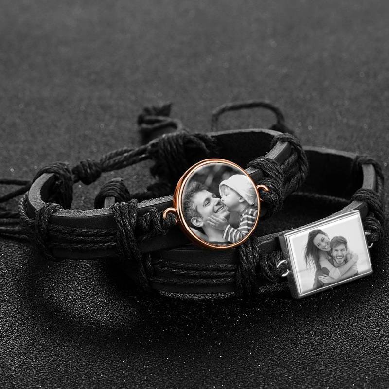 Photocopying Black Leather Round-shaped Photo Bracelet Rose Gold Plated