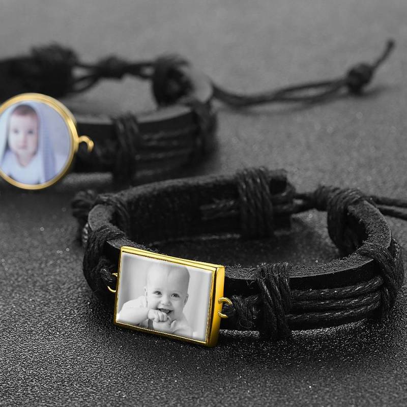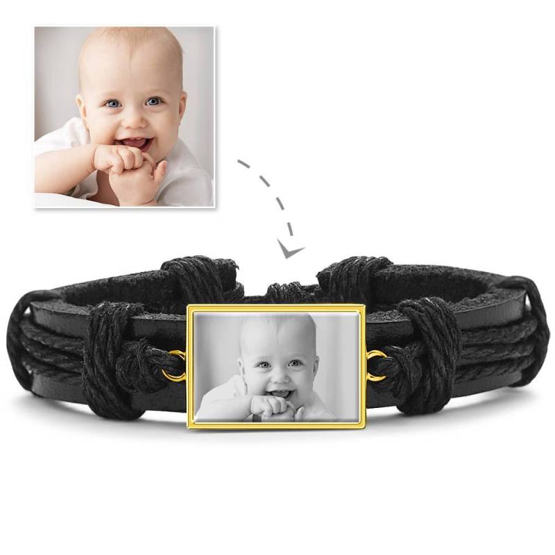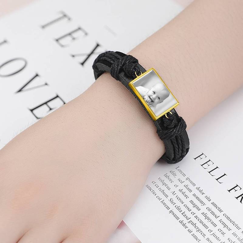Photocopying Black Leather Square-shaped Photo Bracelet 14K Gold Plated
