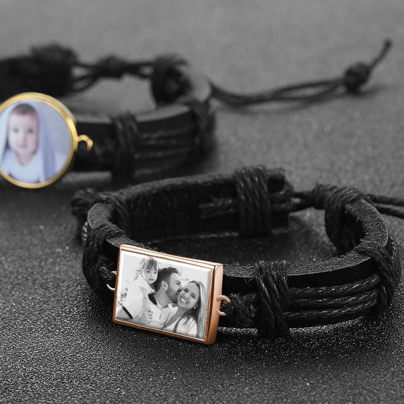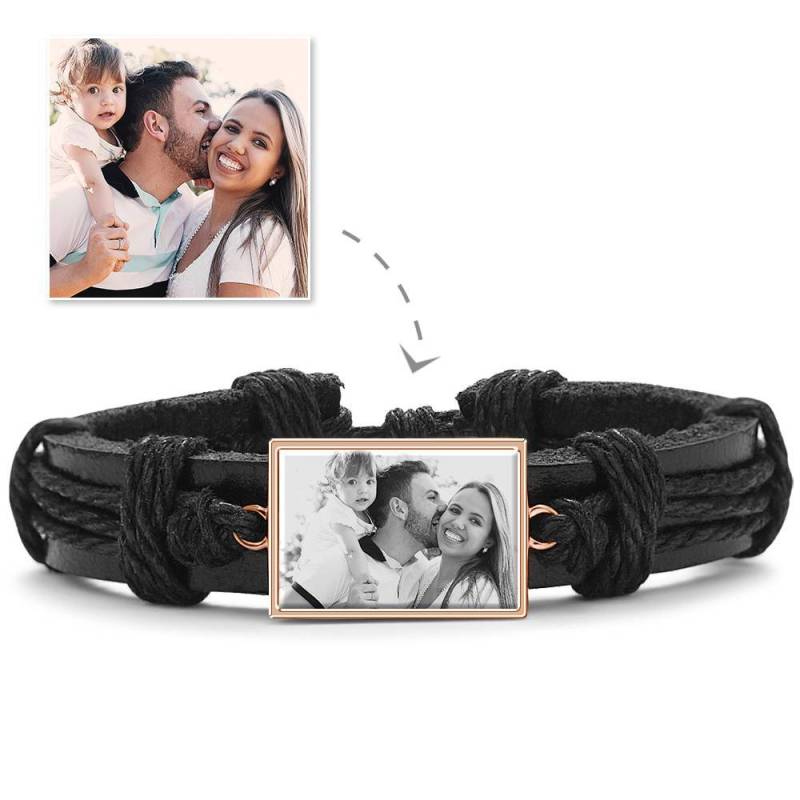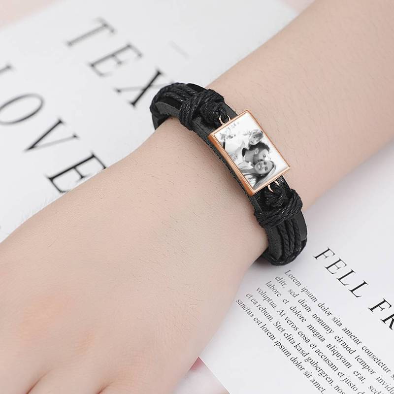 Photocopying Black Leather Square-shaped Photo Bracelet Rose Gold Plated