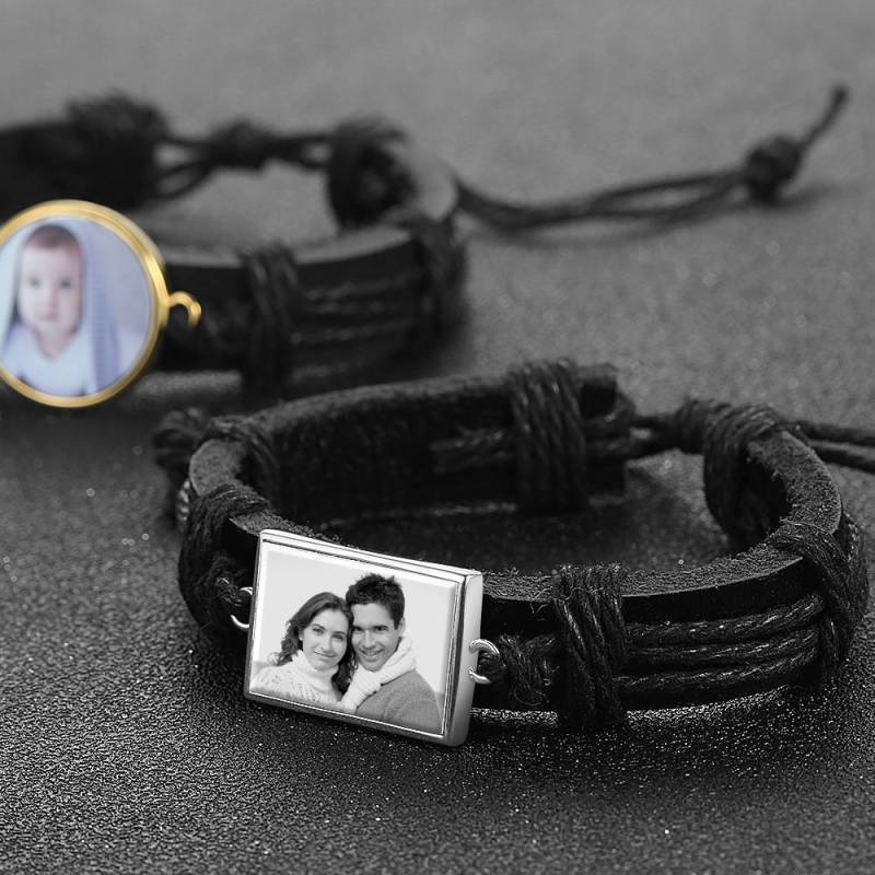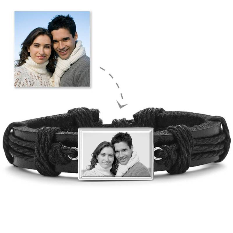Photocopying Black Leather Square-shaped Photo Bracelet Silver Plated