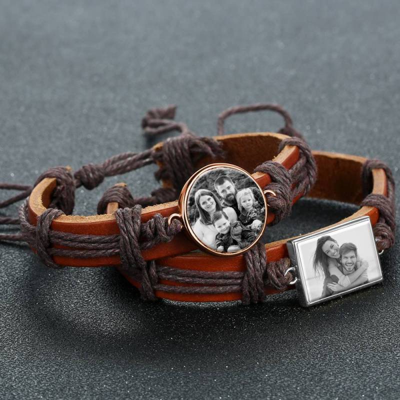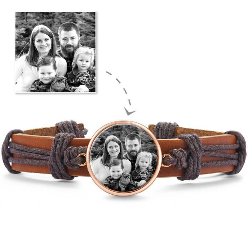 Photocopying Brown Leather Round-shaped Photo Bracelet Rose Gold Plated