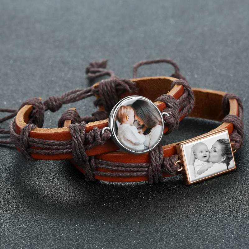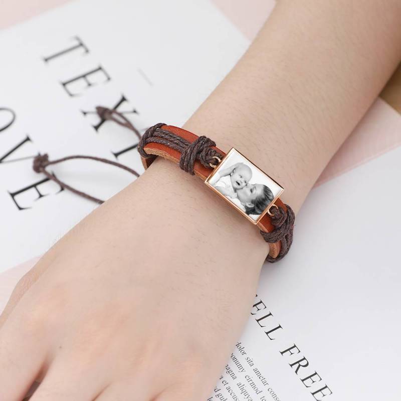 Photocopying Brown Leather Square-shaped Photo Bracelet Rose Gold Plated