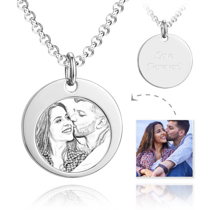 Unisex Round Shape Photo Engraved Tag Necklace with Engraving Stainless Steel