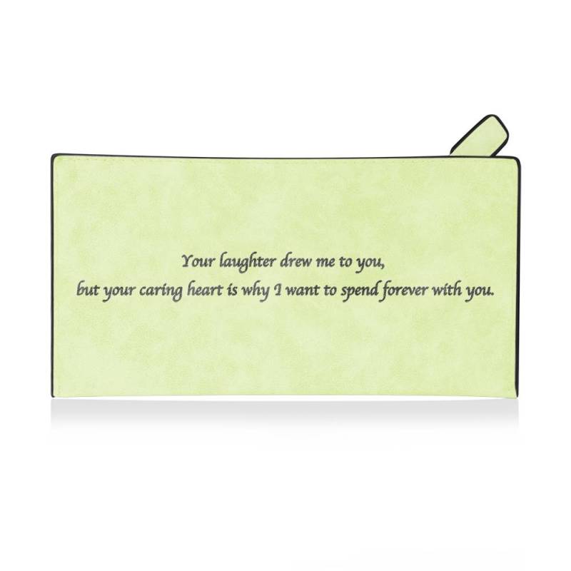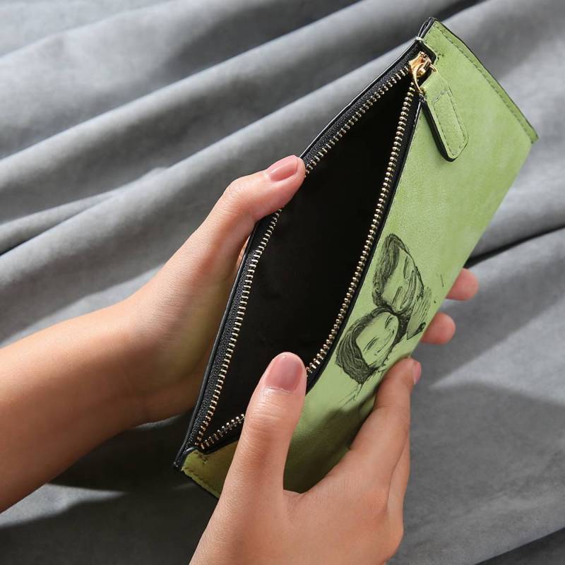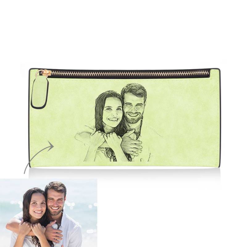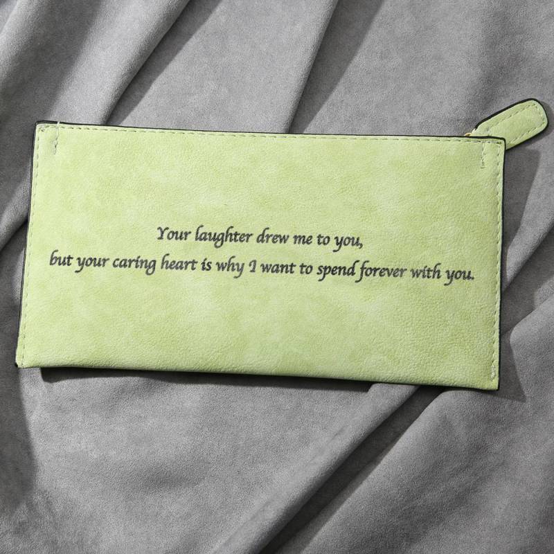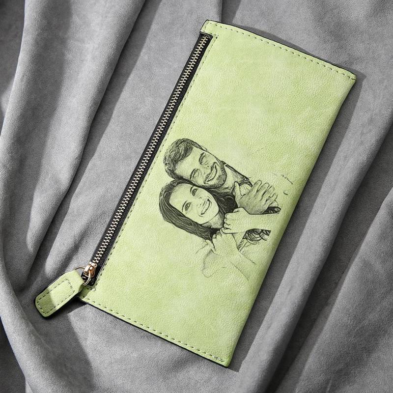 Women's Long Style Custom Inscription Photo Zipper Wallet - Light Green Leather