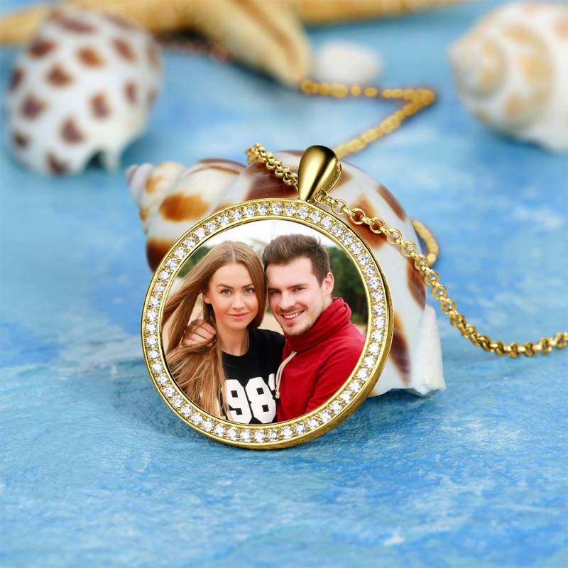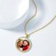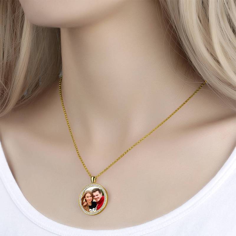 Women's Personalized Rhinestone Crystal Round Shape Photo Engraved Necklace 14K Gold Plated Golden - Colorful