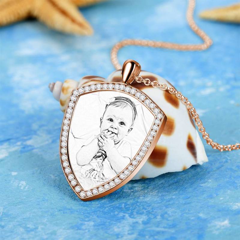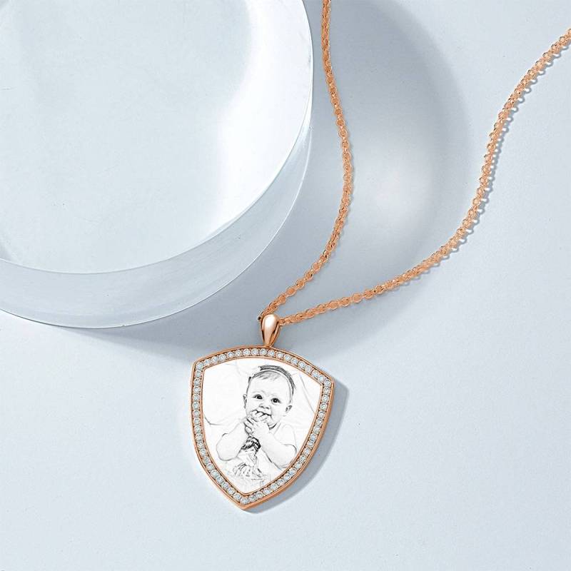 Women's Personalized Rhinestone Crystal Shield Shape Photo Engraved Necklace Rose Gold Plated - Sketch